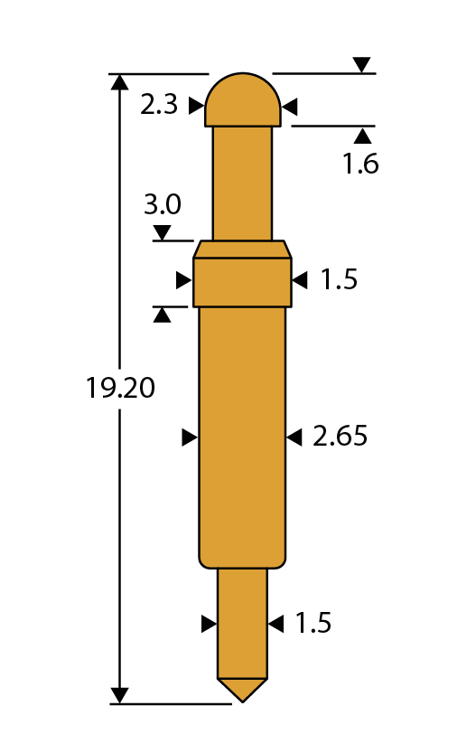 A larger spring contact, similar to the standard PC8 series, differing by having a rigid tail for PCB mounting.