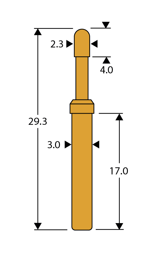 A spring contact with a medium overall length, suitable for use where a rugged construction is required. Solder-in or replaceable with a receptacle.