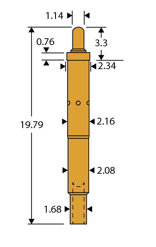A medium sized spring contact with a medium overall length suitable for use where a rugged construction is required. This item is a non-replaceable type and does not need a receptacle. Solder in or wire into solder pot.