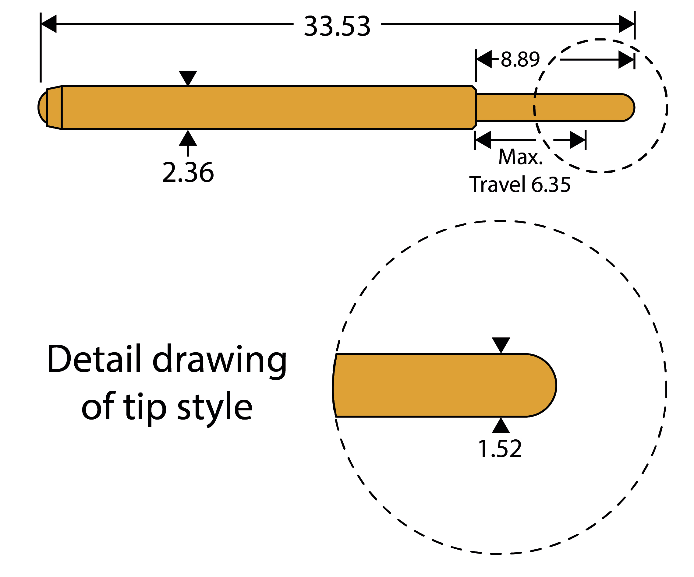 A medium reach, general purpose test probe for testing at a minimum of 4.75mm centres. Plain radius tip-style.