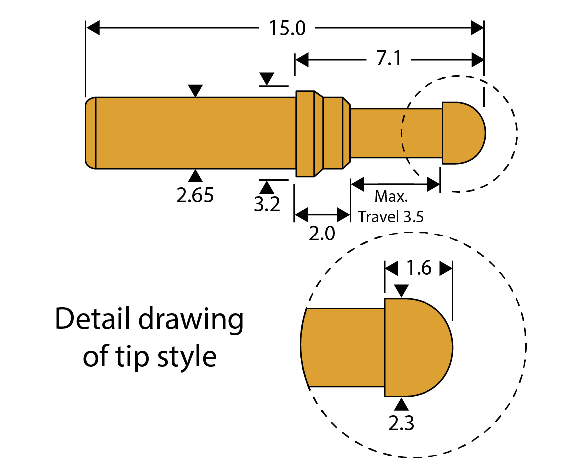 High current test probe for load and functional testing of power components, wound components and batteries. The short overall length is useful in positions where space is minimal. Radius tip-style.